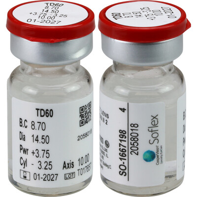 Gläschen mit 1 weichen konventionellen torischen Jahreslinse mit sehr guter dynamischer Stabilisation, hoher Sauerstoffdurchlässigkeit, stabilem Material und geringer Ablagerungsneigung.